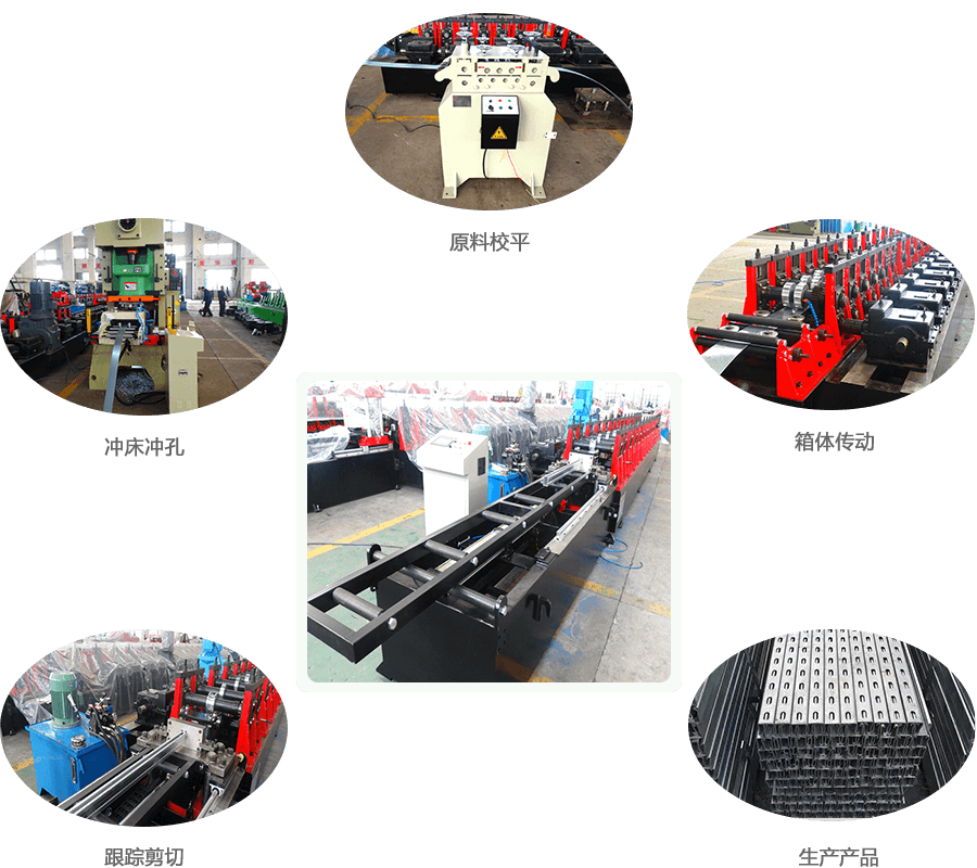 開卷動力整平儲料CN伺服送料+自動沖孔(沖LOGO)儲料壓成型【夾送引料滾壓鋸齒輥壓成型(噴淋冷卻)】伺服跟蹤剪切(或鋸切)出料落料
