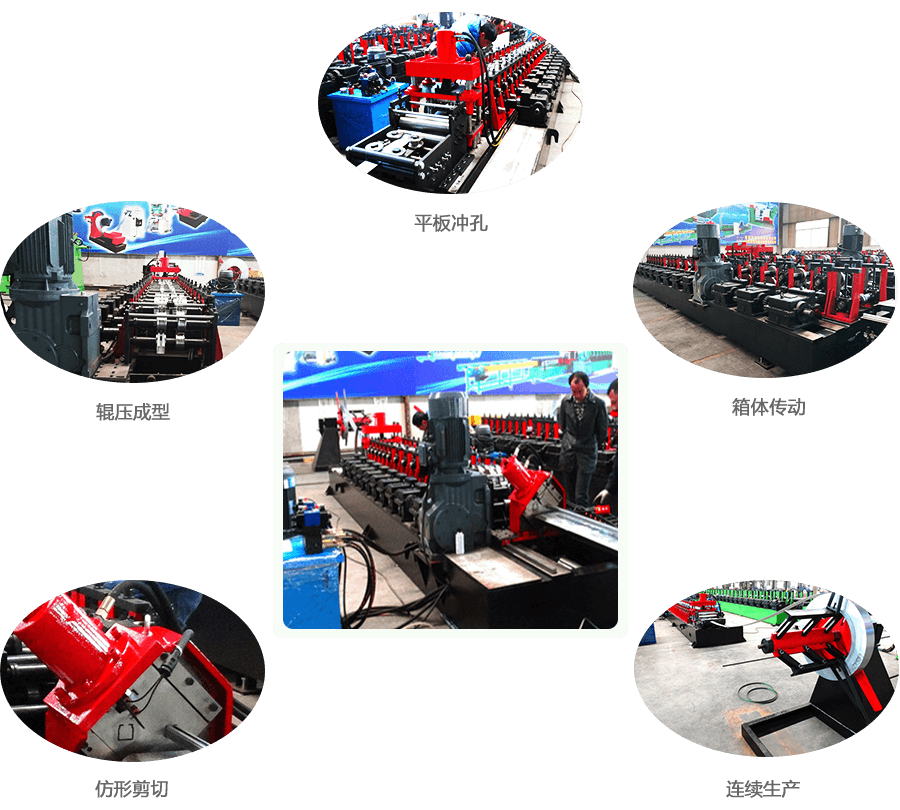 開卷—導向進料—液壓沖孔—輥壓成型—跟蹤切斷—托板出料