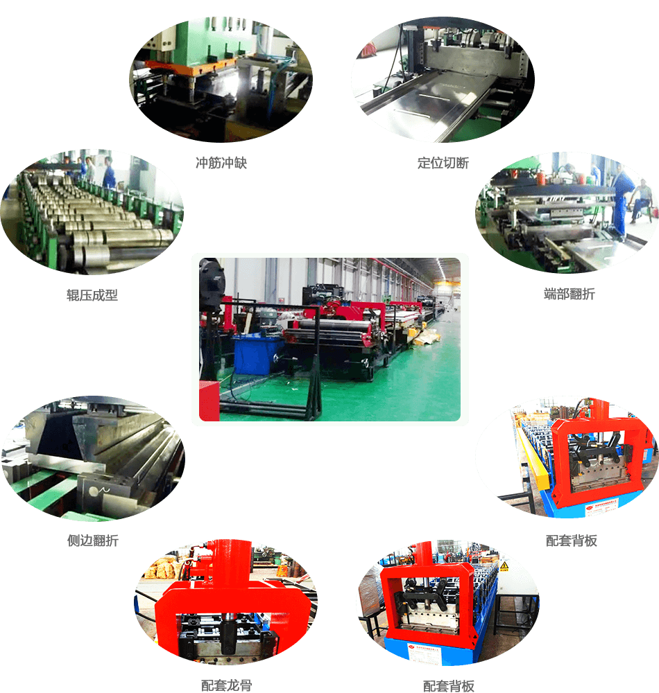 開卷—引料校平—沖孔沖缺—輥壓成型—定位切斷—端部翻折—側邊翻折—托板出料