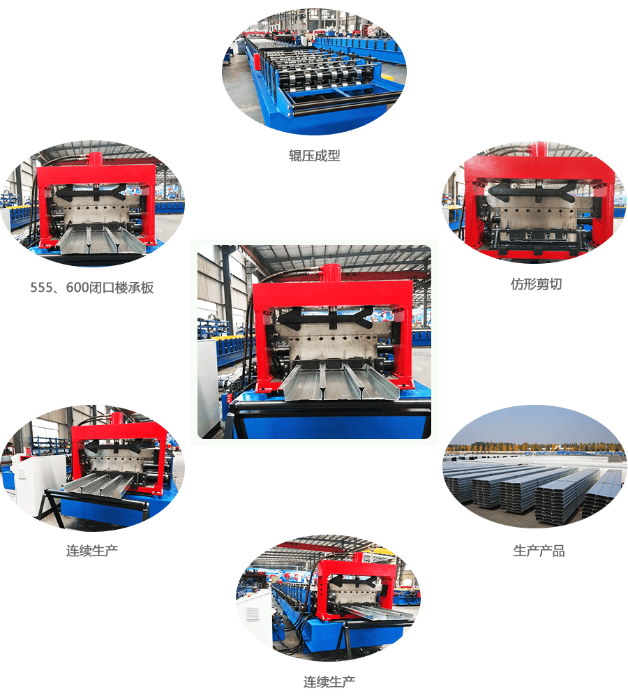 開(kāi)卷—導(dǎo)向進(jìn)料—輥壓成型—鉚合閉合—定尺切斷—托板出料